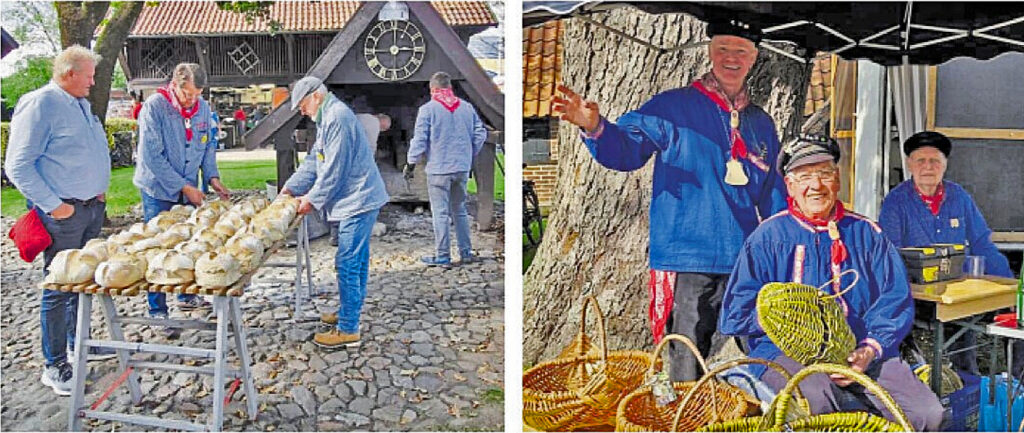 Der Musikzug Gescher 1886 e.V. bringt die Gäste mit einem Frühschoppenkonzert in Schwung, und auch die Kinder kommen nicht zu kurz. Stilecht in Kiepenkerltracht oder Münsterländer Arbeitskluft versorgen Mitglieder des Heimatvereins die kleinen Gäste kostenlos mit Stockbrot. „Wir halten hier alles ehrenamtlich in Schuss“, wird stolz betont. Wer keinen Appetit auf Stockbrot hat, kann sich aber auch an Bratwürstchen oder selbstgebackenen Kuchen gütlich tun. Josef Knuf zeigt derweil interessierten Besuchern die alte Handwerkskunst des Korbflechtens. „Ich gehe jetzt auf die 80 zu, und wenn ich nicht mehr kann, wird das Korbflechten hier aussterben“, bedauert er. Einen Nachfolger hat er leider nicht. Unterstützung erhält der Heimatverein von der Landjugend. Eine liebevoll gestaltete Strohkrone und ein Wagenrad ziehen viele begeisterte Blicke und gezückte Handys auf sich.